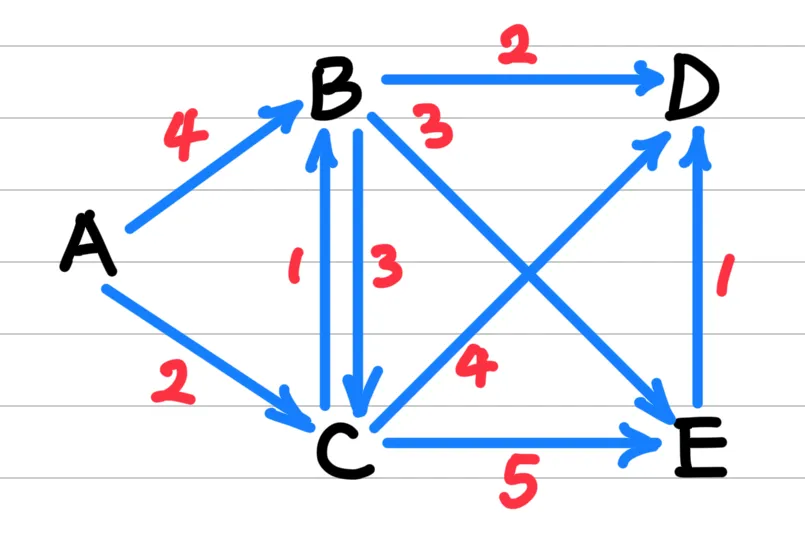 The nodes A, B, C, D, E correspond to the nodes 1, 2, 3, 4, 5 respectively.