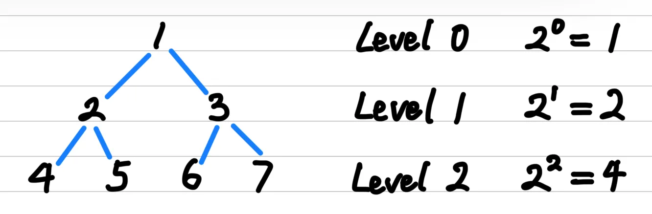- If a binary tree has $k$ levels, the maximum number of nodes at level $k$ is $2^k$, where $k=0,1,2,\cdots$