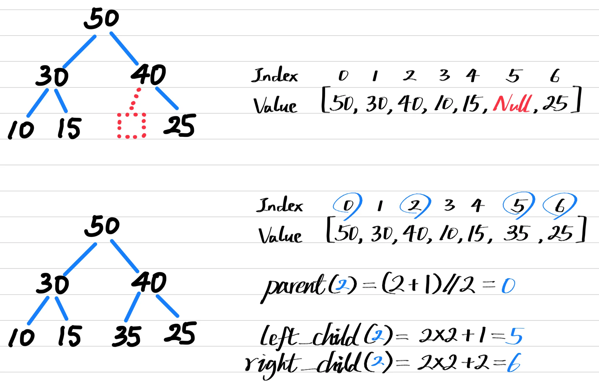 CBTs can be stored in an array without using null values, since there is no gap between nodes due to its properties. This allows efficient indexing (0-based) of parent and child nodes in $O(1)$ time complexity, using simple formulas below: