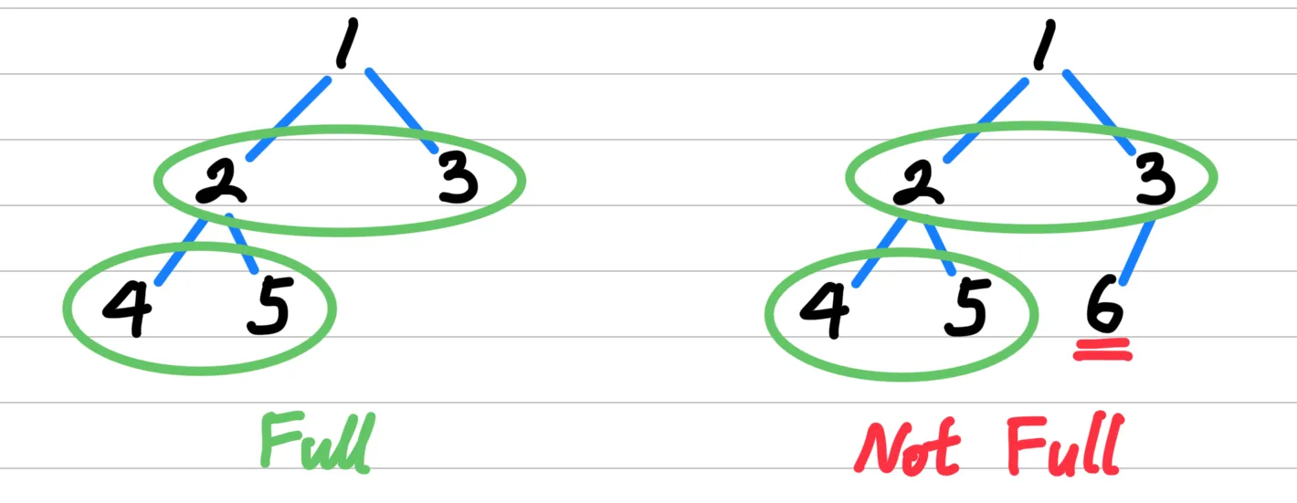 - In other words, if any node has exactly one child (either left or right), then the tree is not a full binary tree.