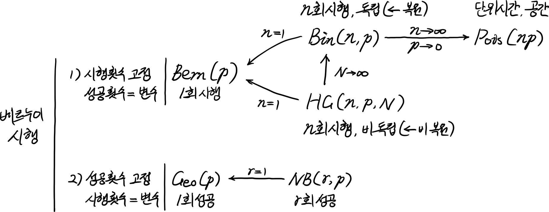베르누이 분포든, 이항분포든, 초기하분포든 결국 베르누이 시행의 횟수를 정해놓은 상황에서 사용할 수 있다. 푸아송 분포도 결국은 정해진 시행을 하나의 단위시간, 공간으로 묶어 생각하기 때문에 이 4가지는 같은 종류라고 볼 수 있다.