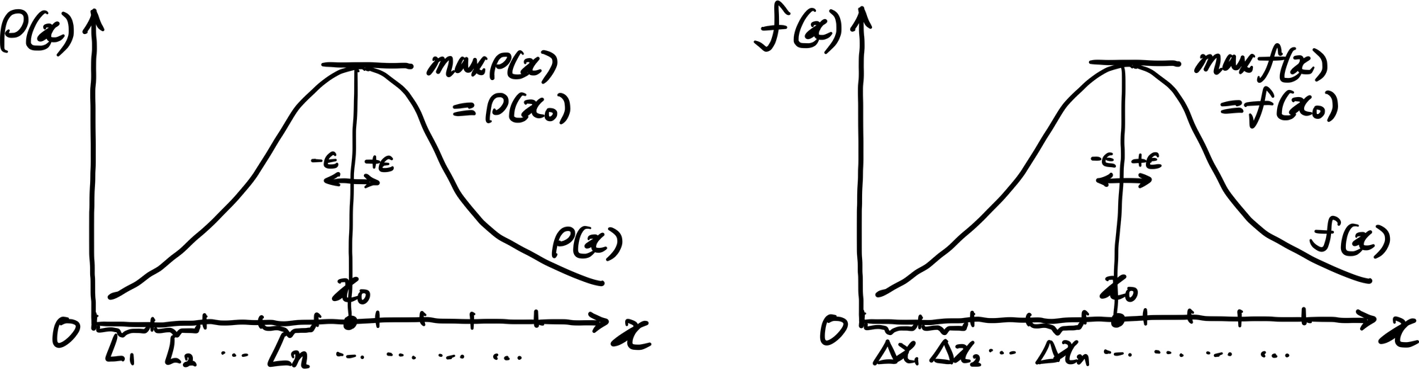 아니, 이것은 어디서 보던 모양이 아닌가? 그렇다. $\rho$대신 $f$를 쓰면 우리가 알던 확률밀도함수의 그래프이다. 그림에서 $\rho(x_0)$이 $\rho(x)$의 최댓값이다. $\rho(x_0)$이 질량이 아니라 $x_0$에서의 밀도 값이지만, 그래도 밀도가 높은 쪽은 비교적 질량이 클 것이다. 정확히는 이 $x_0$근방의 질량 $m(x_0 - \epsilon < x < x_0 + \epsilon)$이 비교적 클 것이다. $\epsilon$은 매우매우 작은 양수이다.