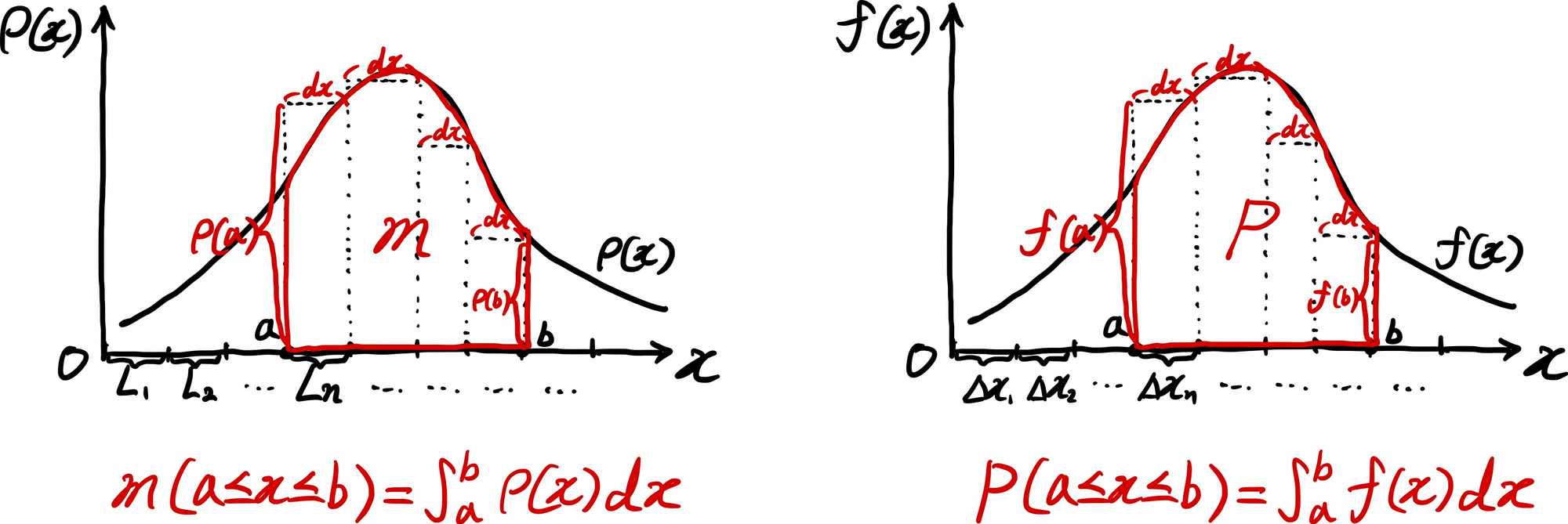 이 비유에 따르면, $P(a \leq X \leq b)$는 ‘확률질량’이다. 그런데 ‘확률질량’이라 하지 않고 확률 값 또는 확률이라고 하는 것 뿐이다. 또한, 연속확률변수 $X$가 특정한 값 $x$를 취할 확률 $P(X=x)$를 굳이 표현하자면 ‘미세한 확률질량’ $f(x)\space\mathrm{d}x$가 되며, 그 값은 0에 가깝다. 구간 $[a,b]$안에서 이 $f(x)\space\mathrm{d}x$들을 모두 더한 값이 곧 $P(a \leq X \leq b) = \int_{a}^{b} f(x)\space\mathrm{d}x$이 된다.