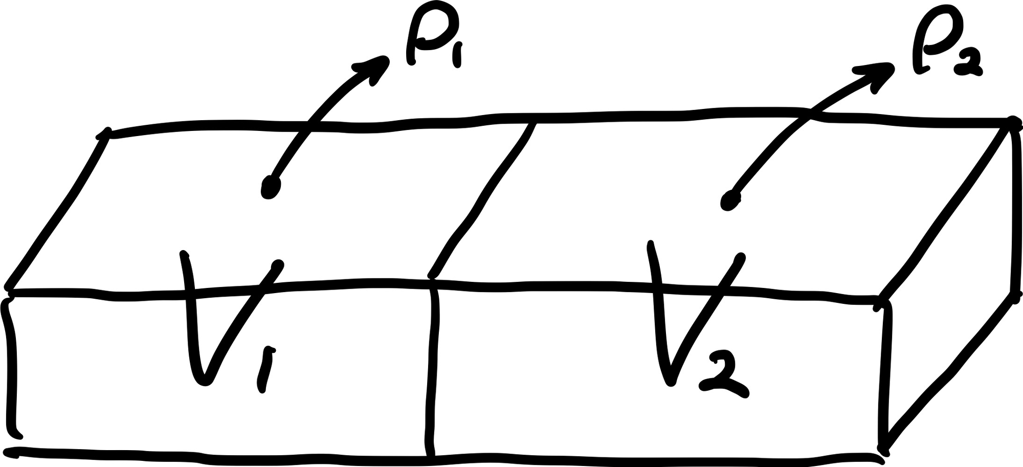 각 부분의 밀도를 $\rho_1 = 0.1\space\mathrm{kg/m^3}$, $\rho_2 = 0.2\space\mathrm{kg/m^3}$, 부피를 $V_1 = 40\space\mathrm{m^3}$, $V_2 = 60\space\mathrm{m^3}$이라고 했을 때, 이 각목의 질량은 다음과 같이 계산된다.
