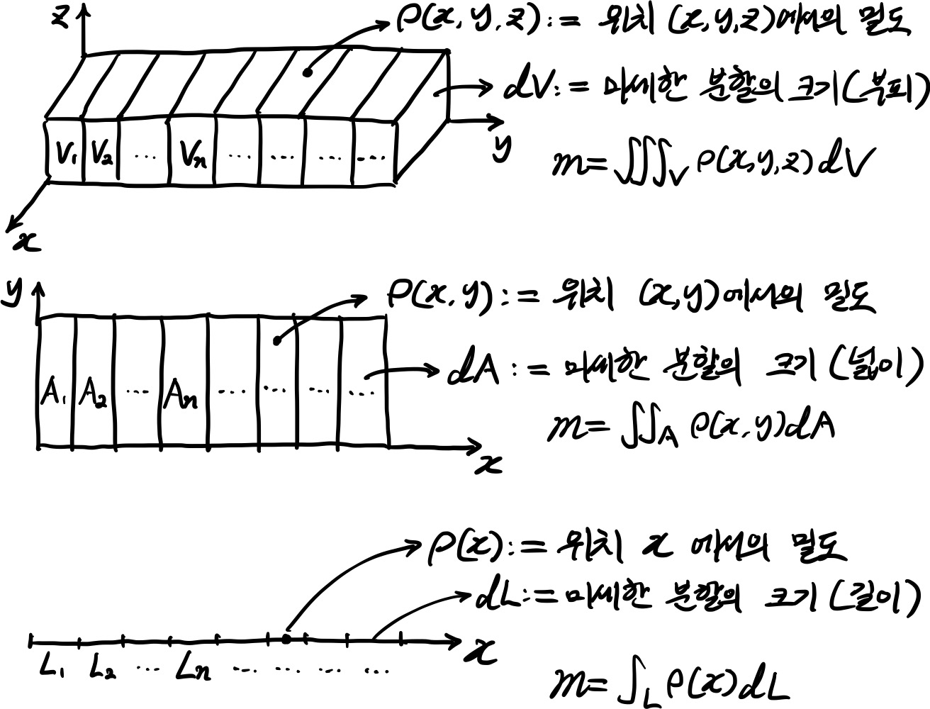 note: 각목을 아주 많은 부분으로 쪼갤 때, 각 부분은 미세한 부피 $\mathrm{d}V$를 갖는다. 또한, 잘게 쪼개는 과정에서 각목의 밀도는 더 이상 상수가 아니고, 어느 위치에 있는가에 따라서 변할 것이다. 즉 밀도는 3차원 위치벡터 $(x,y,z)$의 함수인 $\rho(x,y,z)$이고, 질량은 이 밀도함수를 $V$라는 공간에서 적분한 값이다.