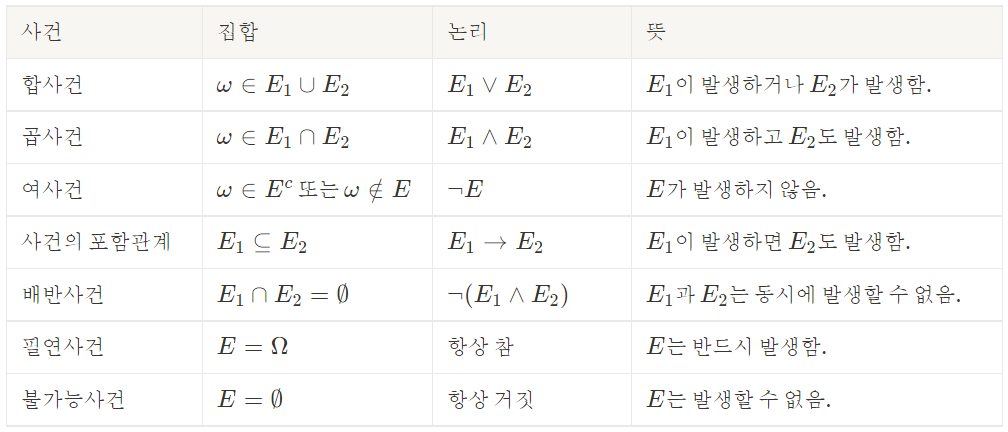또 하나의 좋은 점은 집합의 연산과 논리 연산이 사건의 연산에 그대로 적용된다는 것이다. 자주 쓰이는 사건의 연산과 관계를 정리하면 다음과 같다: