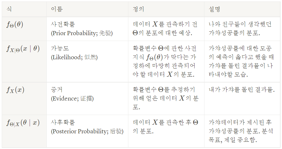 표에 제시된 식의 순서는 베이즈 추정의 작업순서와 같다. 즉, 사전확률, 가능도를 정의하고 증거를 수집한 후, 사후확률을 추정한다. 이제 베이즈 추정을 본격적으로 시작해보자.