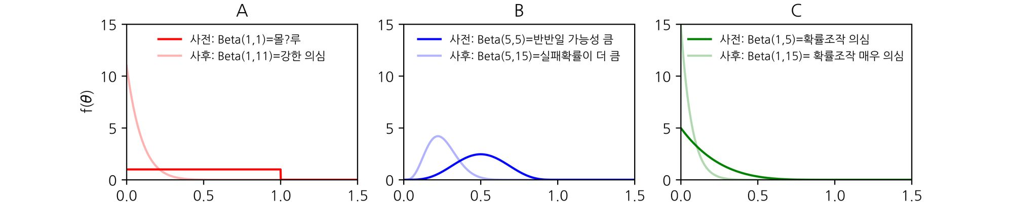 A는 확률이 0~1사이라고 믿기 때문에 그 구간에서 수평선이다. B는 0.5라고 믿기 때문에 그 지점에서 확률밀도가 제일 높고, 멀어질 수록 낮아진다. C는 0에 가깝다고 믿기 때문에 그 지점에서 확률밀도가 제일 높고, 멀어질 수록 낮아진다.