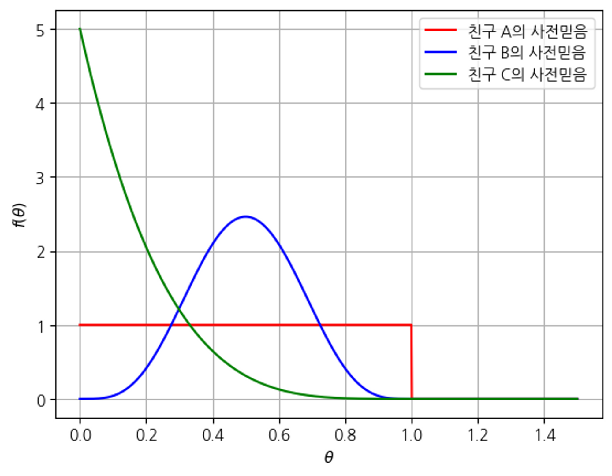 가챠를 돌리기전, 즉 데이터를 관측하기 전의 나는 친구 B의 입장과 가까웠다. 그런데 가챠를 돌린후 친구 C의 입장과 비슷해졌다. 이를 수학적으로 어떻게 모델링할 수 있을까? 우선 각 입장을 묘사하는 PDF를 그려보자.