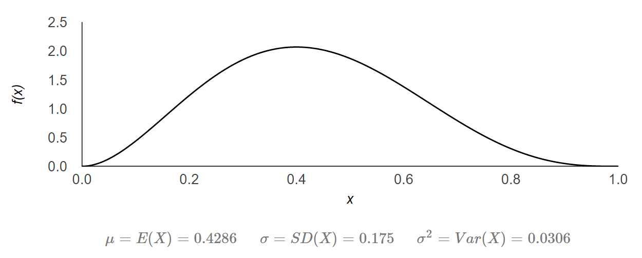 이제 믿음직스럽지 않은 전적인 2승 3패도 모델링해보자. 승률을 확률변수 $X$라고 놓으면, $X \sim \mathrm{Beta}(3,4)$이고, PDF는 다음 그림과 같다.