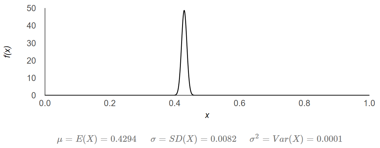 이 분포의 PDF를 관찰하면 $X = 0.4$근처에서 확률밀도가 매우 높음을 알 수 있다. 즉 플레이어 A의 승률이 0.42 근처에 있을 확률이 비교적 높고, 오히려 다른 값에 있는 경우가 극단적인 경우에 속한다. 데이터는 평균인 0.42 근처에 집중적으로 관찰되며, 분산은 0.0001로 매우 작다. 그러므로 이 플레이어가 자신의 승률이 0.42정도라고 말한다면 그 말이 믿음직스러운 것이다.