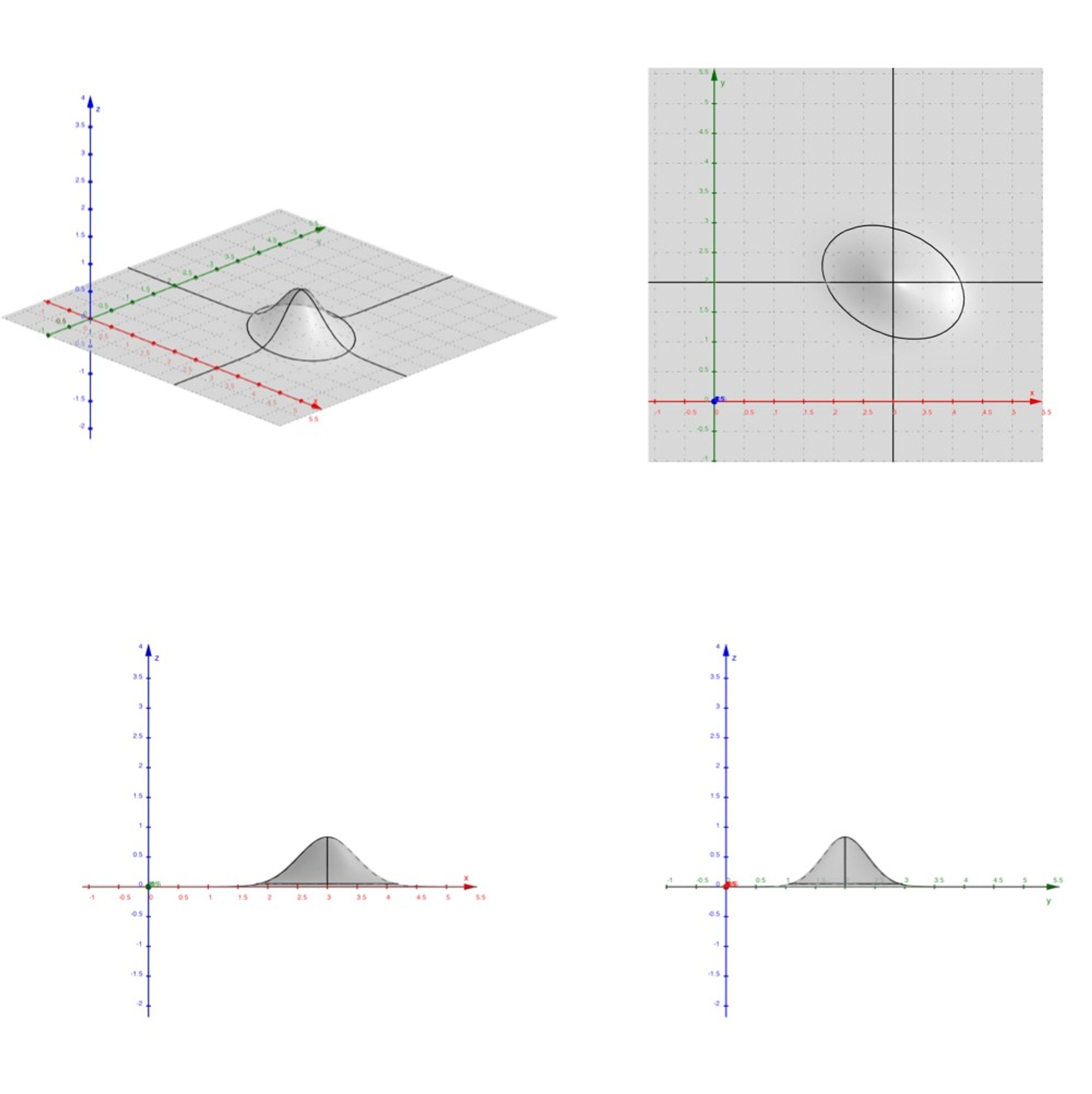 이차곡면을 연구할 때와 비슷하게, 이변량 정규분포의 그래프를 잘라서 연구해보자. (이차형식 참조.) 우선 가로로 잘라보자. $f(\mathbf{x;\boldsymbol{\mu},\Sigma})=\mathrm{constant}>0$로 두면 다음과 같이 이차곡선을 얻는다. ($\mathbf x=(x,y)^\mathbf T$로 둔다.)