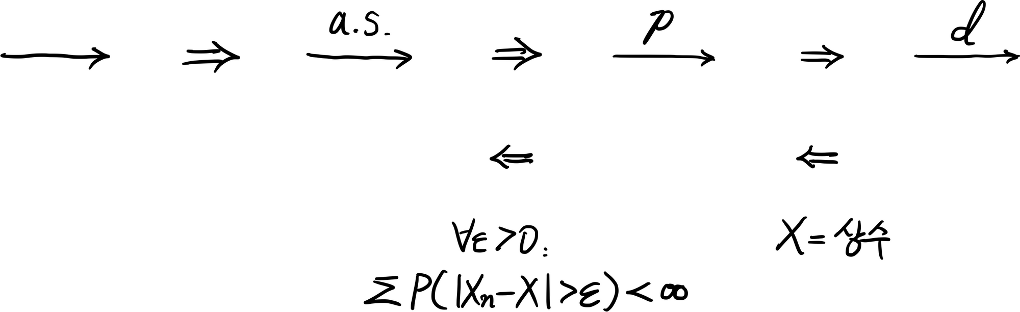 우선, 일반적인 수렴의 강약에 의해 확실한 수렴부터 분포수렴까지 쭉 유도할 수 있다. 그리고 $X$가 상수라는 조건이 주어지면 분포수렴에서 확률수렴을 유도할 수 있고, 또 추가조건이 주어지면(수렴속도가 충분히 빠르면) 확률수렴에서 거의 확실한 수렴을 유도할 수 있다.