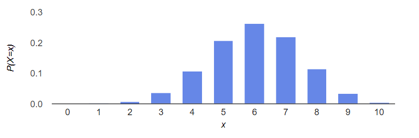 함수 $f(x)={60 \choose x}{40 \choose 10-x}/{100 \choose 10}$의 식을 알았으니 그것의 그래프를 그려보자. 가로축에 독립변수인 $x$, 세로축에 종속변수인 $P(X=x)=f(x)$를 놓자. $x$의 값이 뚝뚝 떨어져있으므로 그래프도 여러개의 점 또는 막대의 형태로 그려질 것이다. 여기서는 막대의 형태로 그렸다.