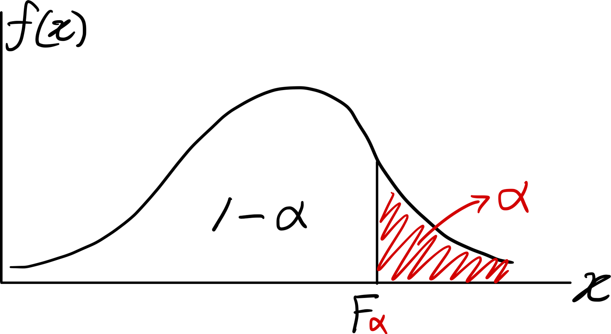 분위수의 개념이 헷갈리는 것은 제$(1-\alpha)$ 분위수의 기호가 $F_{1-\alpha}$가 아니라 $F_{\alpha}$이기 때문이다. 하지만 그림과 기호만 기억하고 ‘제$(1-\alpha)$ 분위수’라는 개념은 머리속에서 삭제해버리면, 조금 덜 헷갈린다. 큰 쪽, 오른쪽만 신경쓰는 것이다. 마찬가지로 $F_{1-\alpha}$도 오른쪽에 $(1-\alpha)$만큼의 면적이 있다.