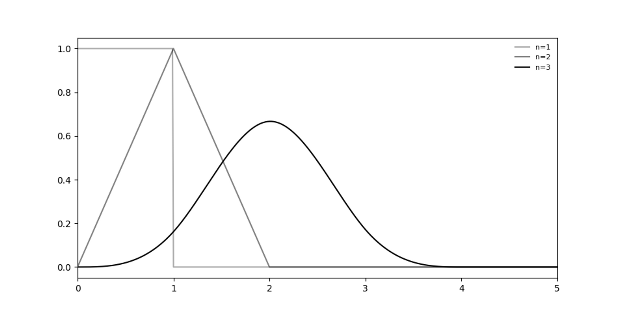 그래프를 그려보면, $n=3$인데 벌써 정규분포 비슷한 모양을 띈다.