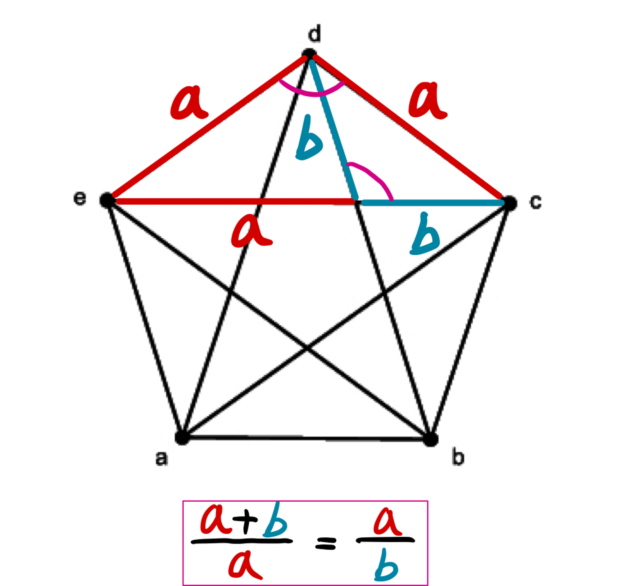위 그림처럼 점 $C$가 선분 $\overline{AB}$를 $a:b$로 내분하는 모습을 상상해보자. 이때 만약 다음과 같은 방정식을 만족하면, 내분의 비율 $a:b$는 황금비다.