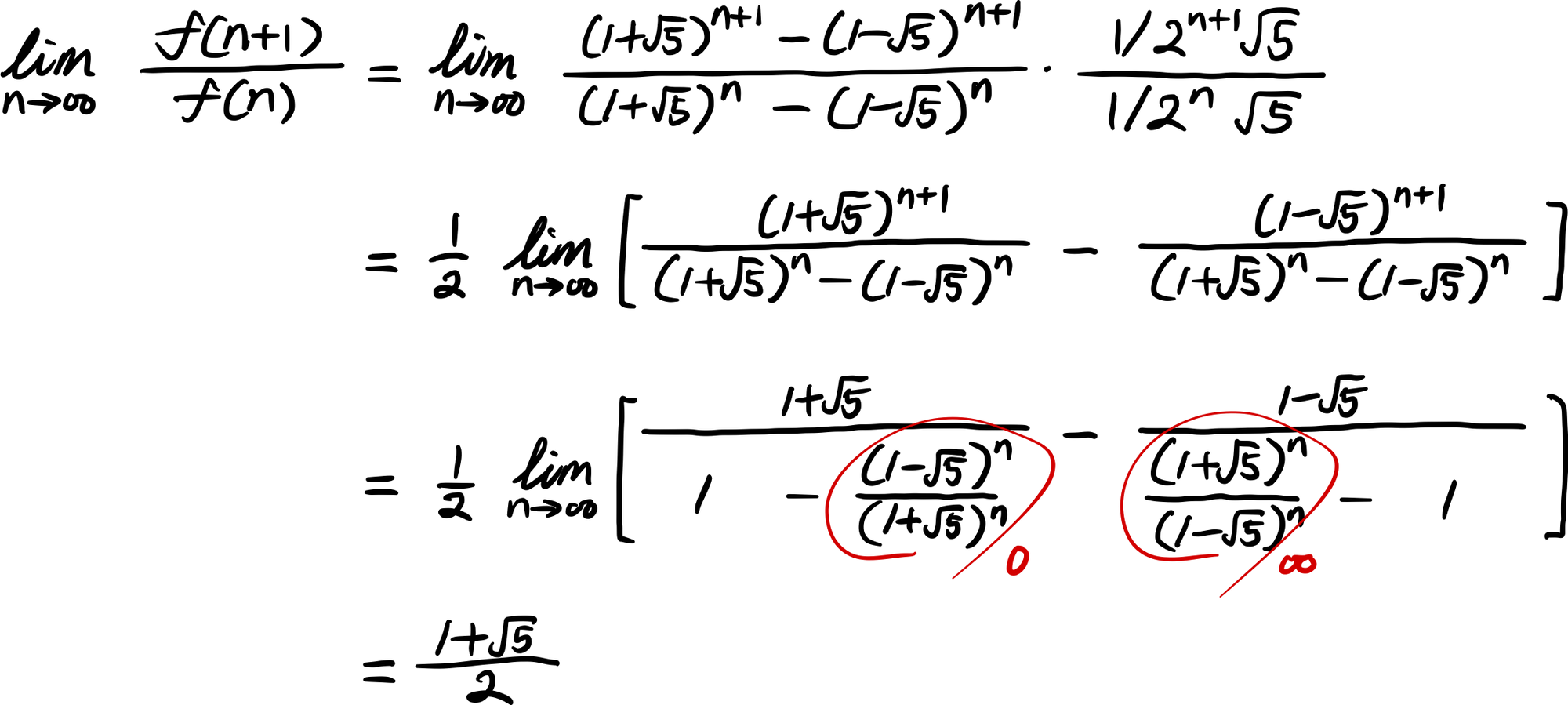 ‘피보나치 수열에서 $n$이 충분히 큰 경우 딱 황금비만큼 증가하는 것’을 수학적으로 표현하면