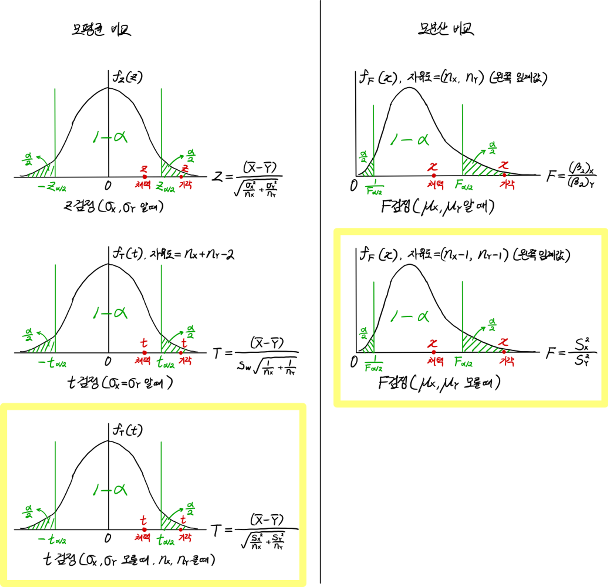 # 1. 모평균 차이 $(\mu_X-\mu_Y)$ 관련 가설검정