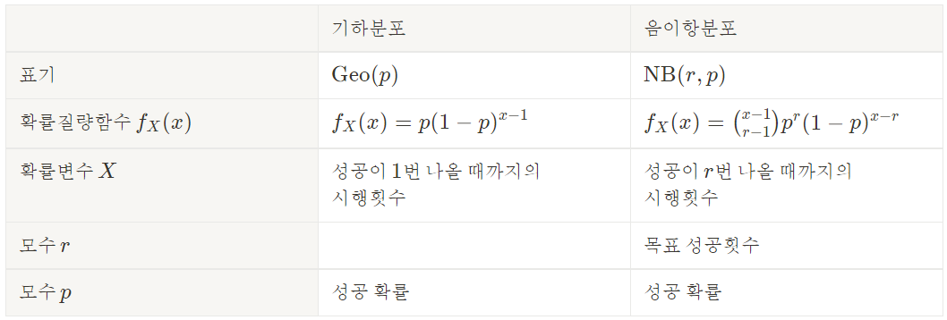 비교하면, 음이항분포는 기하분포의 일반화라는 것을 쉽게 알 수 있다. 즉 다음이 성립한다:
