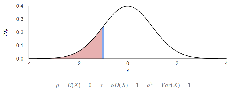 이제 실제로 정규분포 $\mathrm{N}(\mu,\sigma^2)$의 그래프를 그려보자. 여기서는 $(\mu,\sigma^2)=(0,1)$로 두고 그렸다. 그림에서 빨간 부분은 정규분포의 CDF이다.