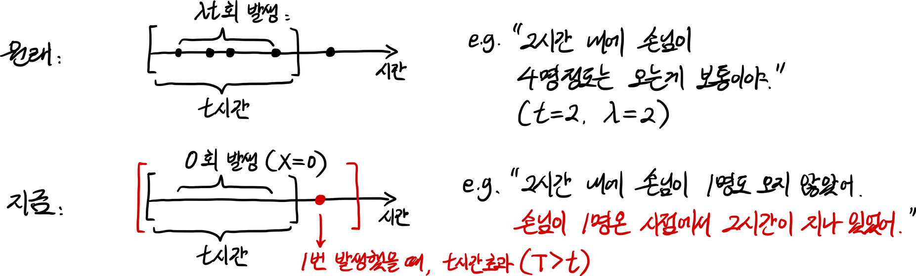 관측값 $x=0$이라고 두면, $P(X=0)=e^{-\lambda t}$는 ‘평균 발생횟수가 $\lambda t$인 어떤 사건이 $t$시간내 1번도 발생하지 않을 확률’이다. 이를 뒤집어서 생각하면 ‘평균 발생횟수가 $\lambda t$인 어떤 사건이 1번 발생하기까지 $t$시간이 넘게 걸릴 확률’이다.