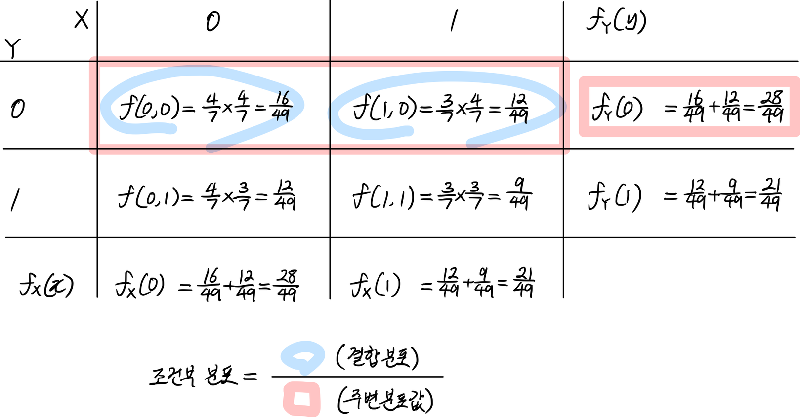 예를 들어 복원추출에서 $Y=0$이라는 조건 하의 $X$의 분포 $f_{X\mid Y}(x\mid 0)=P(X=x\mid Y=0)$는 다음과 같이 구한다.