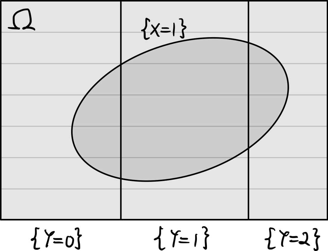 \lbrace X=1\rbrace=\lbrace X=1\rbrace\Omega=\lbrace X=1\rbrace\left(\sum_{y=0}^{2}\lbrace Y=y\rbrace\right)=\sum_{y=0}^{2}\lbrace X=1\rbrace\lbrace Y=y\rbrace