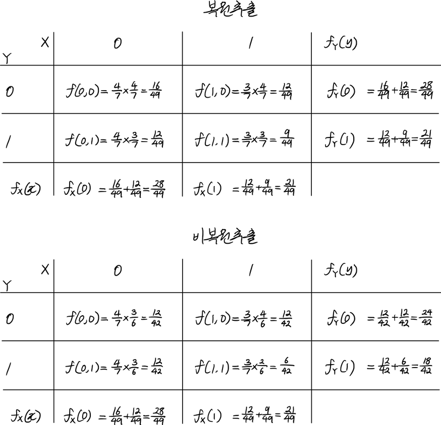 이제 $X$와 $Y$의 결합분포를 구해보자. 결합분포는 다음과 같이 표로 나타낸다. (표는 함수를 나타내는 아주 좋은 방법이다.) 폴리아 항아리 모형에서는 공을 꺼냈다가 도로 항아리에 집어넣는 복원추출과 그렇지 않는 비복원추출이 구분된다. 복원추출은 매 확률시행의 독립을 보장하는 반면, 비복원추출은 그렇지 못하다. (고전적 확률 참조.) 이 점을 감안하여 두 가지 경우로 나누어 $f(x,y)$를 구해보자.