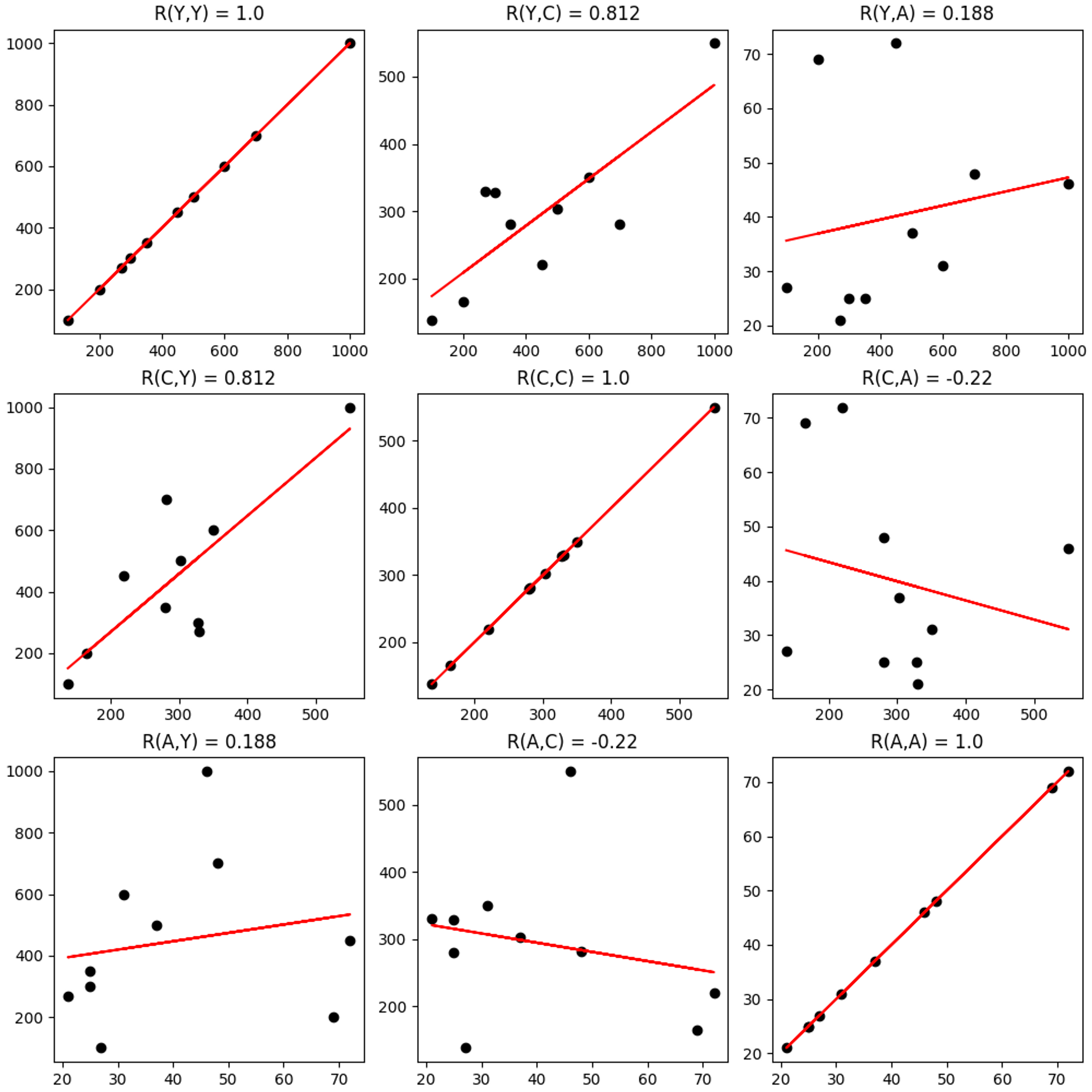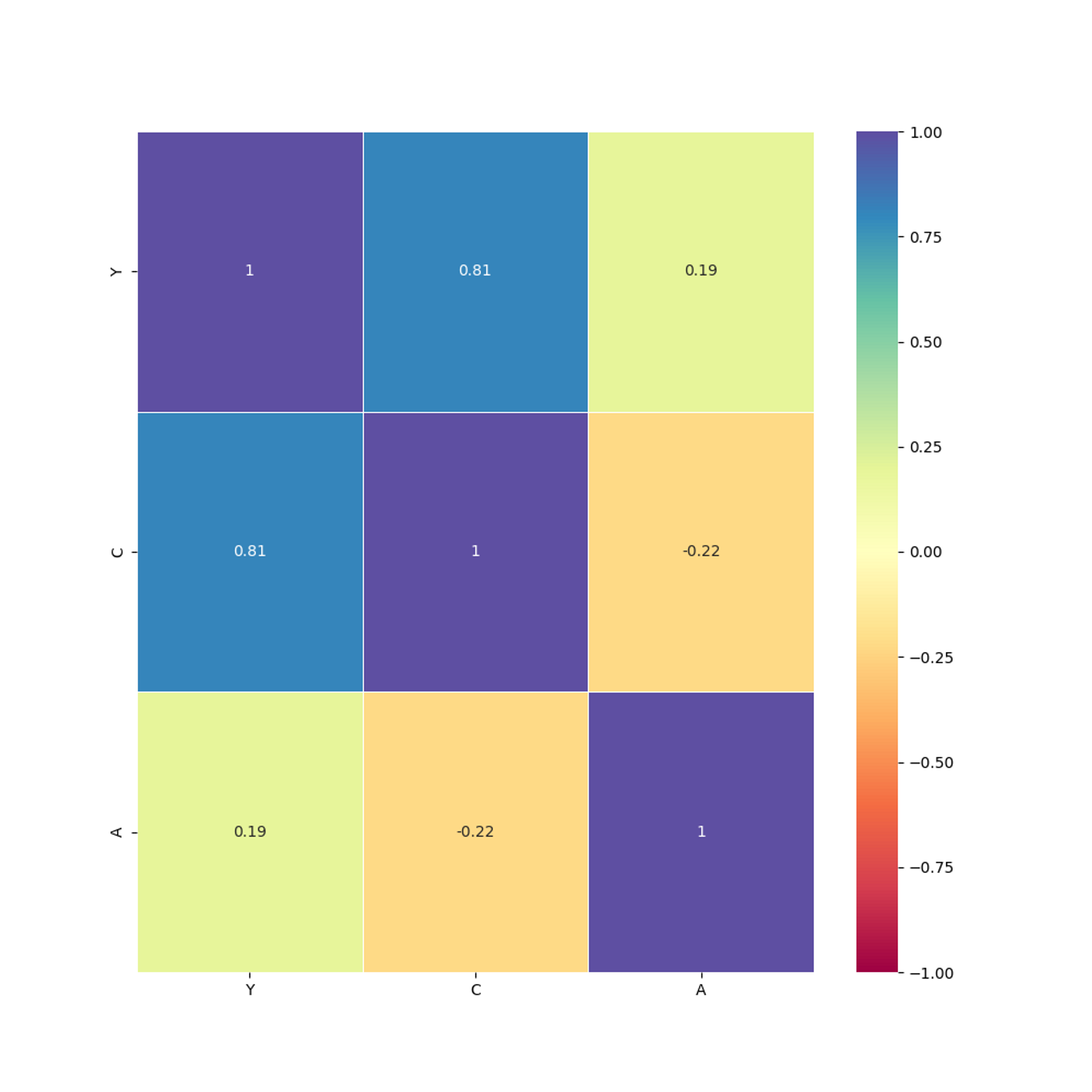 우선, $R(Y,C)=R(C,Y)=0.81$로 같다. 새로운 변수를 추가하더라도 원래의 상관관계에는 영향이 없다. 그리고 $C$와 $A$, $Y$와 $A$모두 상관관계가 약한 것으로 드러났다. 한편, 주대각선의 성분은 모두 1이며, 상관행렬은 대칭행렬이다.