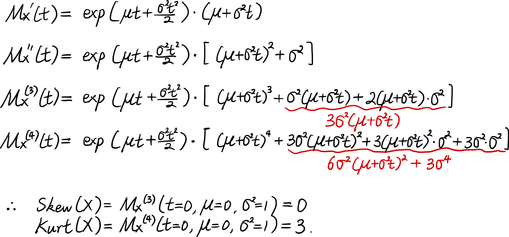 그리고 이렇게 구한 적률생성함수를 3, 4번 미분하고, 거기에 $t=0$, $\mu=0$, $\sigma^2=1$을 대입해야 비로소 3, 4차 표준화 적률인 왜도와 첨도가 구해진다.
