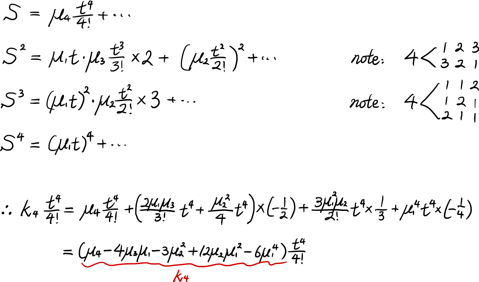 &\kappa_4=\mu_4-4\mu_3\mu_1-3\mu_2^2+12\mu_2\mu_1^2-6\mu_1^4