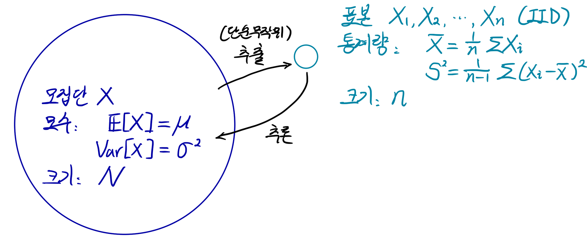 하나의 모집단은 특정한 하나의 확률변수 $X$에 대응된다. 예를 들어 공장의 불량률이 $p$인 생산라인에서 생산된 물품이 불량인 사건을 $\lbrace X=1\rbrace$, 불량이 아닌 사건을 $\lbrace X=0\rbrace$으로 둘 수 있고, 이때 모집단 $X$가 베르누이 분포를 따른다고 표현한다.