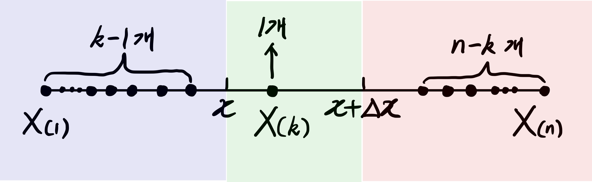 $$ \begin{split} X_1,\cdots,X_n에서\enspace &(k-1)개의\enspace X_i\le x, \\ \enspace &1개의\enspace X_i\in(x,x+\Delta x], \\ \enspace &(n-k)개의\enspace X_i>x+\Delta x \end{split} $$
