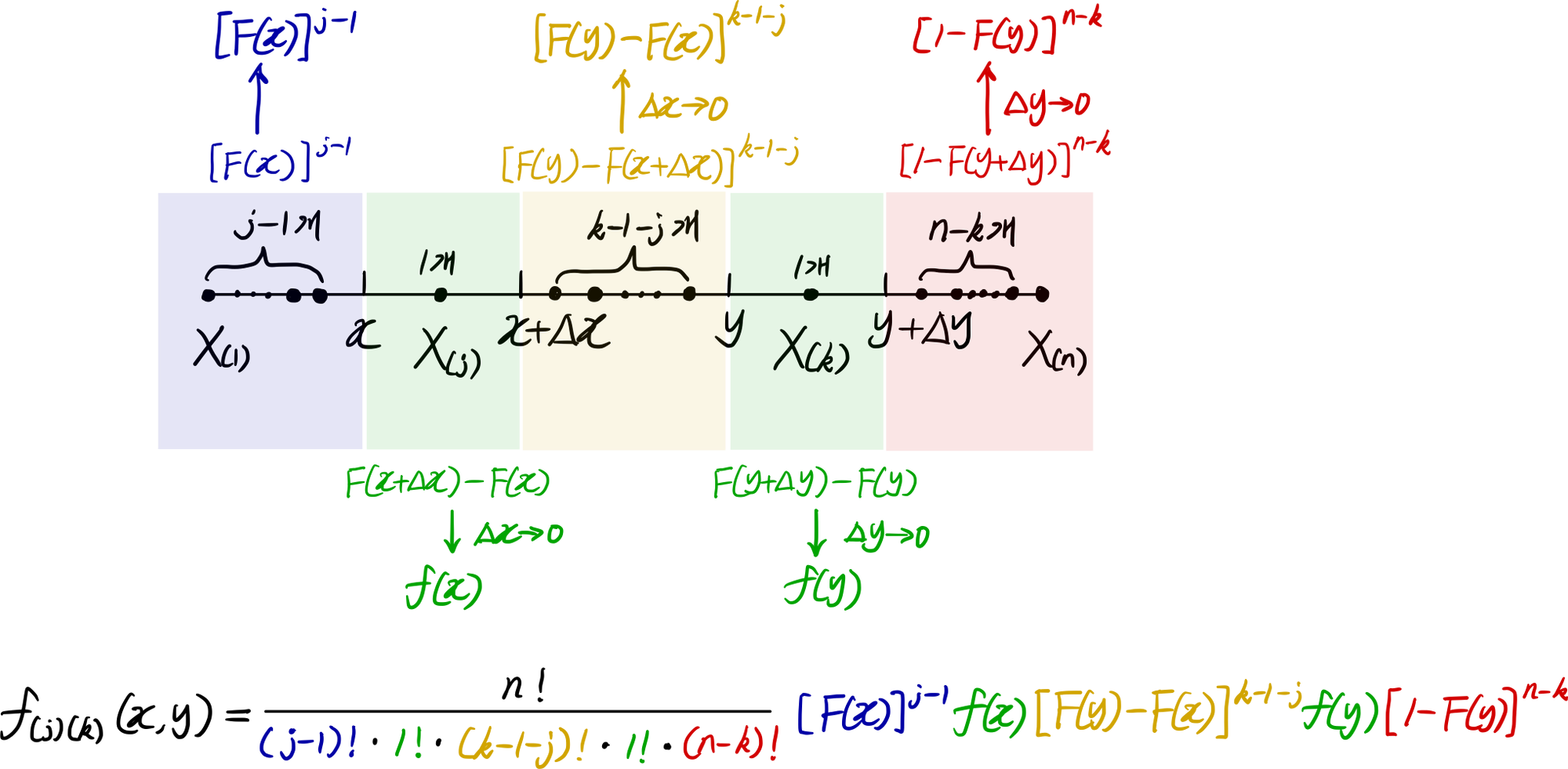 먼저 $f_{(j)(k)}(x,y)$를 구해보자. ($x\le y$를 가정.) 위에서 썼던 방법 그대로, 확률질량