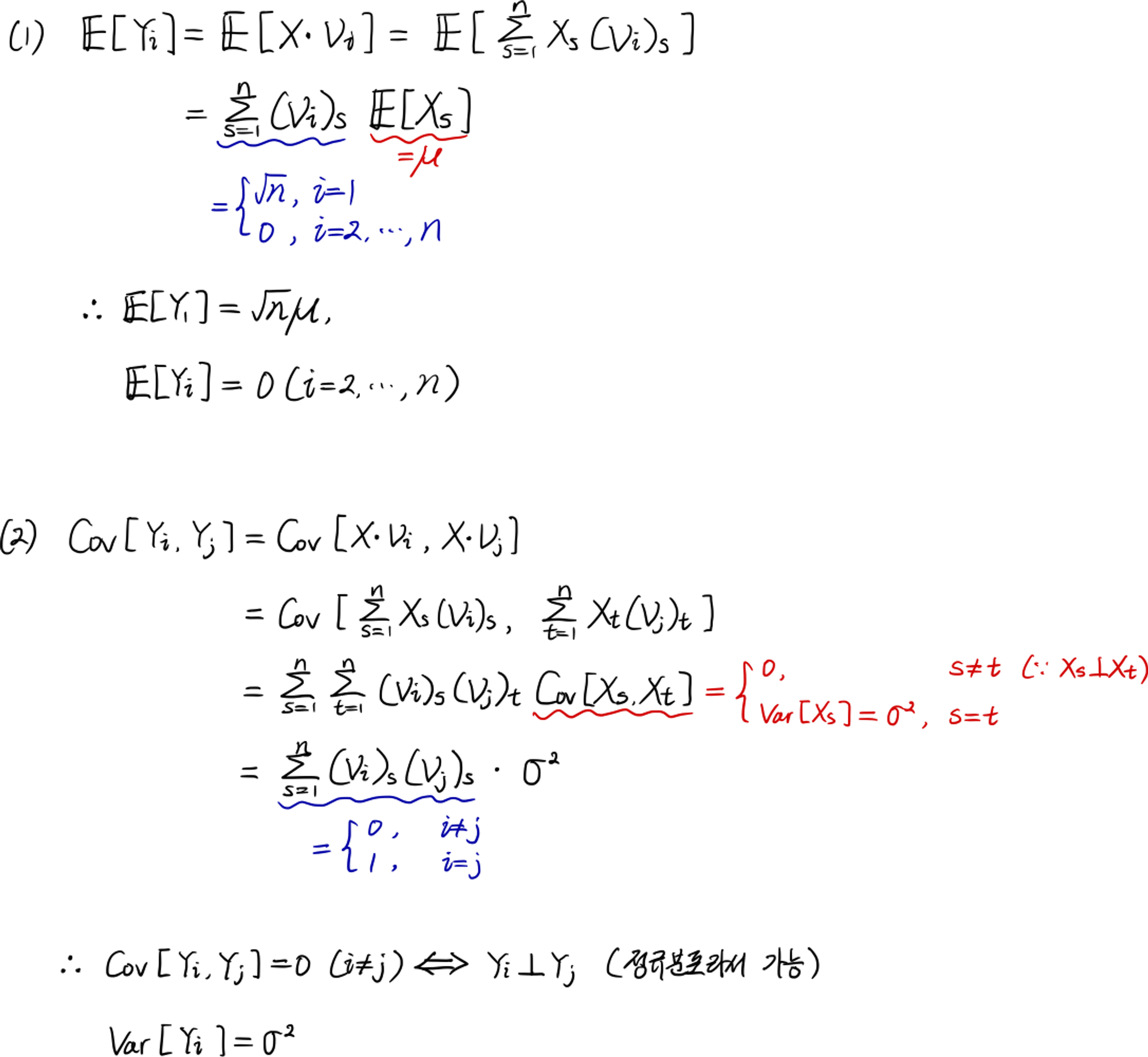 이제 마지막으로 변환후의 평균과 분산이 각각 $\mathbb{E}[Y_i]=0(i=2,\cdots,n)$, $\mathrm{Var}[Y_i]=\mathrm{Cov}[Y_i,Y_i]=\sigma^2$인지만 보면된다.