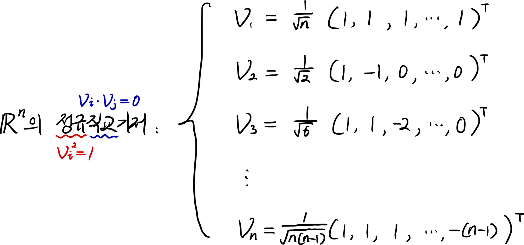 첫번째 기저벡터를 정했으므로, 그 다음은 $\mathbf{v}_i(i=2,\cdots,n)$을 쭉쭉 구해나갈 수 있다. 구해낸 모든 기저벡터를 써보면 다음과 같다.