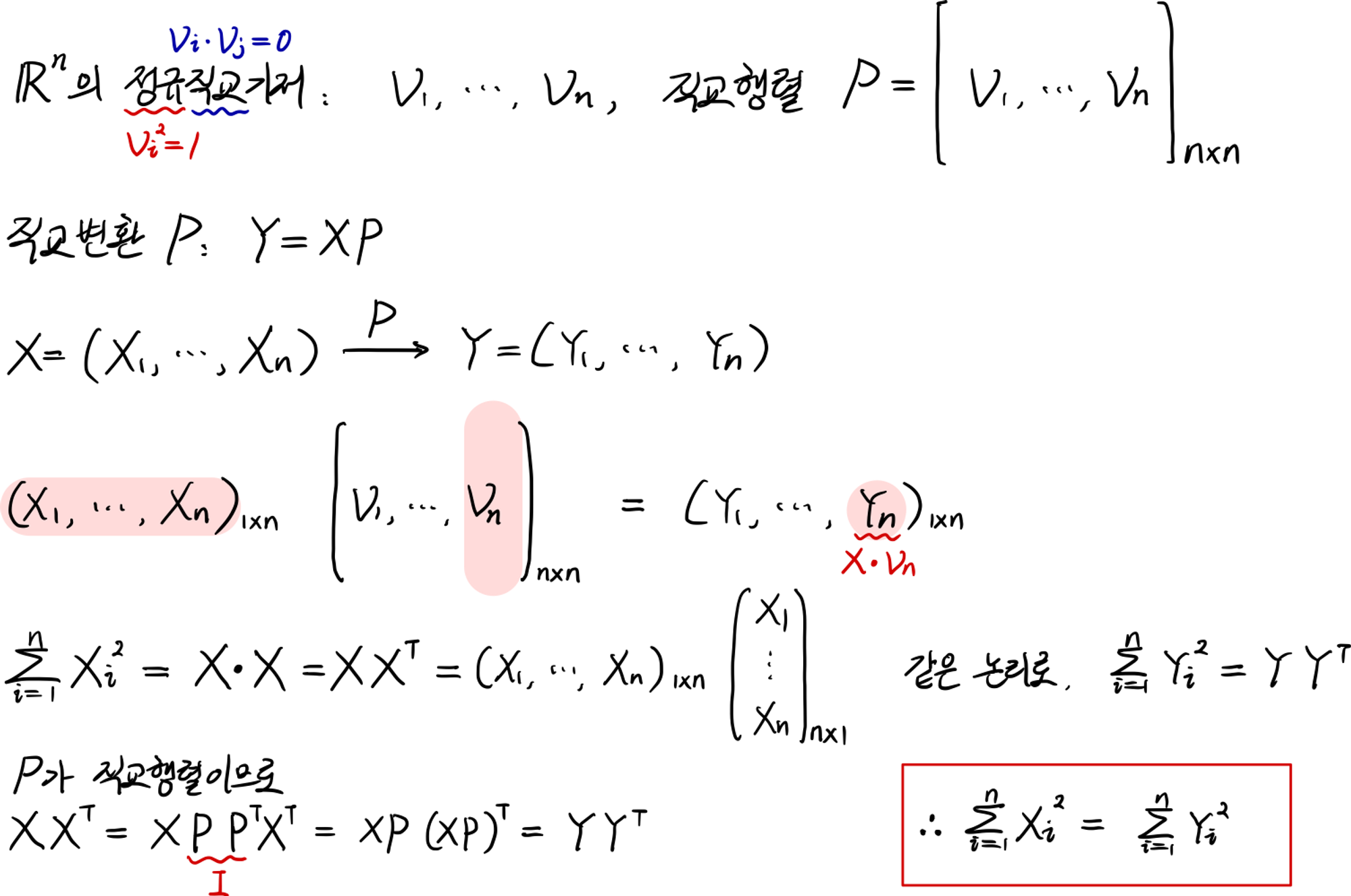 $\sum_{i=1}^{n}X_i^2=\sum_{i=1}^{n}Y_i^2$, 즉 $\mathbf{XX^T}=\mathbf{YY^T}$가 되도록 하려면, $\mathbf{P}$는 직교행렬이면 좋을 것이다. 직교행렬이라면 다음이 성립하기 때문이다.