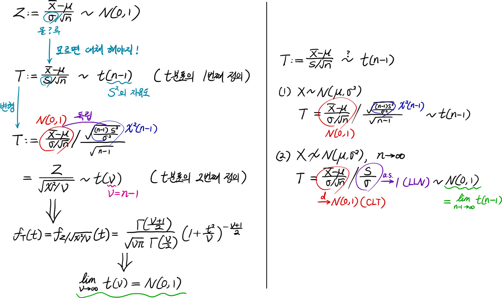 즉, 분자는 z분포를 따르는 확률변수로, 분모는 카이제곱분포를 따르는 확률변수의 변형으로 나타낼 수 있다. 물론 모집단은 정규분포를 따른다는 가정이 있어야 한다. 따라서 t분포를 다음과 같이 재정의할 수 있다.