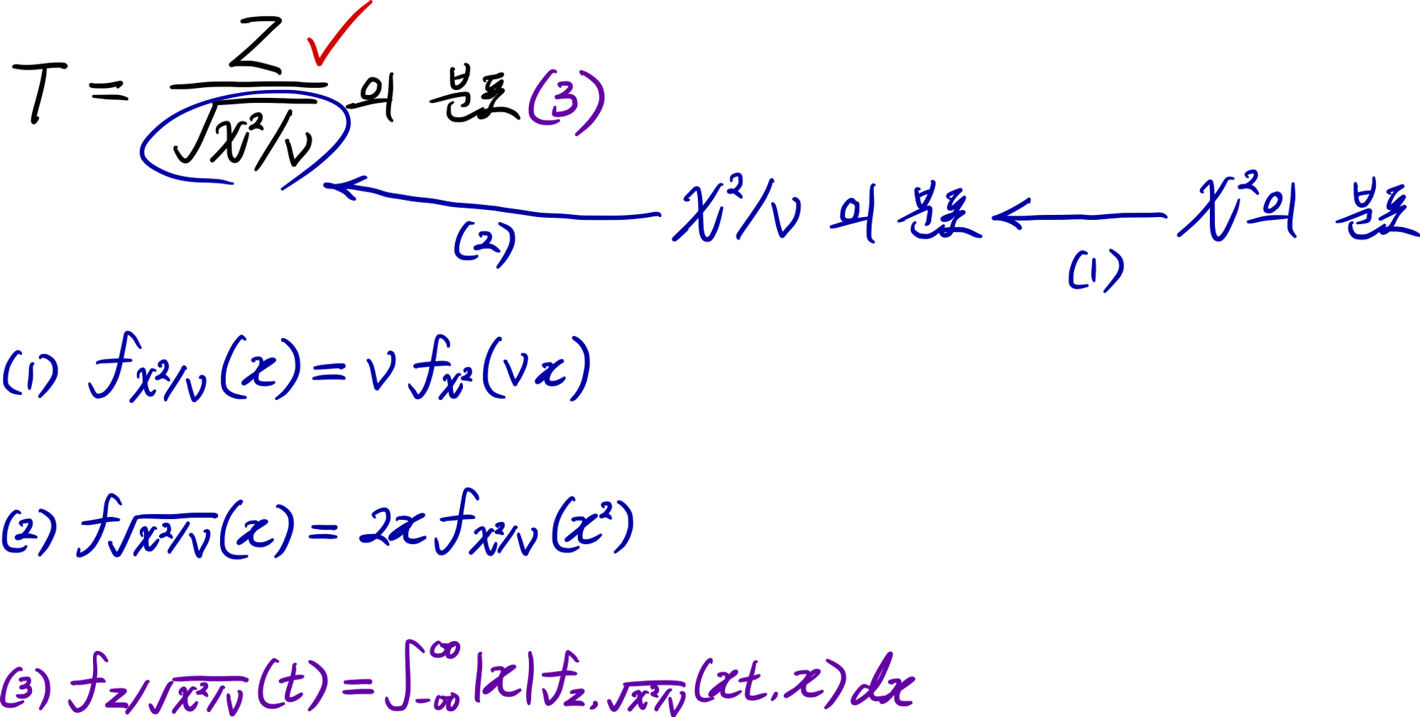 지난 글에서 확률변수의 변환과 사칙연산의 분포를 다뤘다. 이 내용을 t분포의 확률밀도를 유도하는 데 써먹을 것이다.