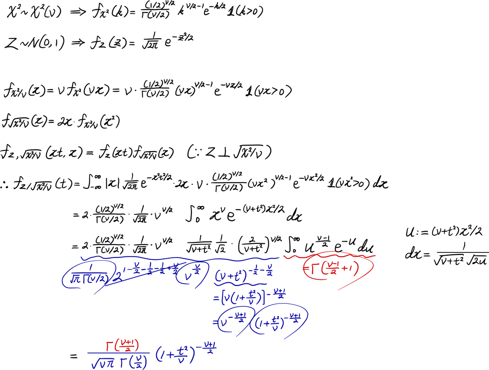 계산과정: $u$의 거듭제곱과 $e^{-u}$를 곱한 것의 적분을 감마함수로 나타낼 수 있음을 생각하면서 그런 형태가 되도록 적절히 치환해야 됨. $Z$ 통계량과 $\chi^2$ 통계량이 서로 독립인 점도 이용해야 함. (‘표본분산의 분포’의 이해와 증명 참조.) 지시함수는 적분구간을 전체 실수구간에서 양의 실수구간으로 바꾸는 역할을 한다.