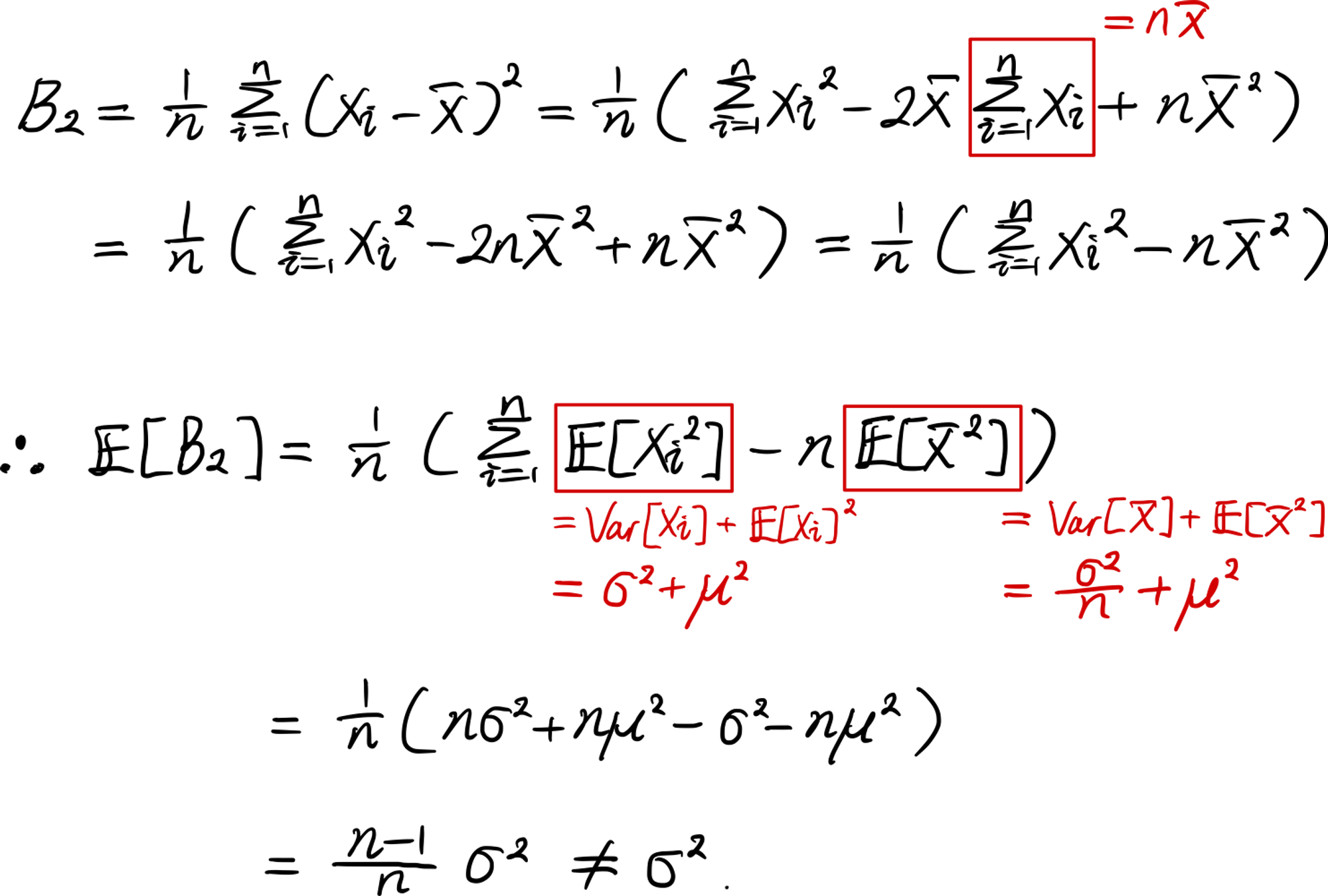 $B_2$가 편향을 가지는 이유는 모분산을 추정하려고 하는데 모평균마저 몰라서 그것을 표본평균 $\bar{X}$로 대체했기 때문이다.