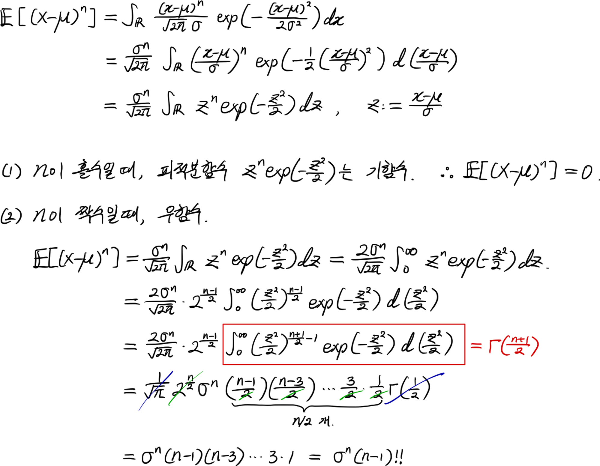 note: 정규분포에서 $n$이 홀수일때 $\mathbb{E}[(X-\mu)^n]=0$이고 짝수일 때 $\mathbb{E}[(X-\mu)^n]=\sigma^n(n-1)!!$이다. 증명: