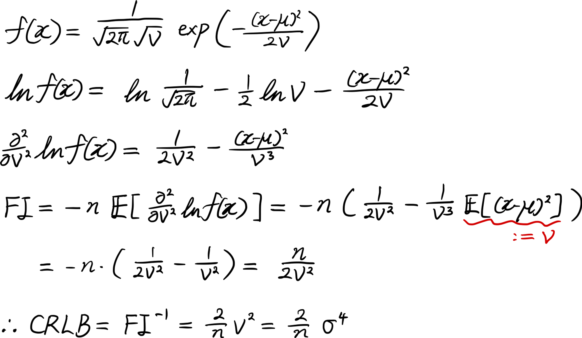 정규분포 모분산의 불편추정량의 효율성을 논의하기 위해, 피셔 정보와 크라메르-라오 하한을 구해보자. 모평균을 $\mu$, 모분산을 $\sigma^2=:v$라고 표기하자.